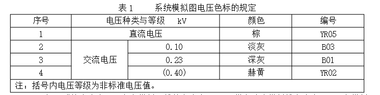 10.3體系模擬圖應(yīng)依據(jù)運(yùn)轉(zhuǎn)電壓等級(jí),按表1規(guī)則的色彩標(biāo)明,色彩所對(duì)應(yīng)的色標(biāo),由制作廠或制作廠與用戶之間洽談確定。