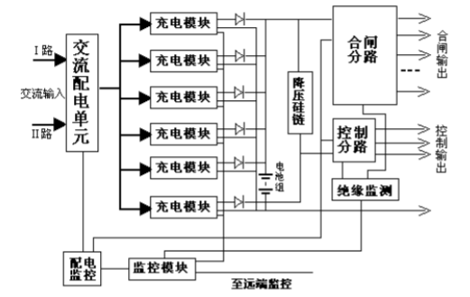 直流屏由高頻開關(guān)整流模塊,可編程控制器(PLC,蓄電池組,絕緣監(jiān)督裝置,蓄電池自動(dòng)監(jiān)測(cè)裝置,母線電壓自動(dòng)調(diào)理裝置,觸摸屏,預(yù)告信號(hào)裝置等組成。蓄電池采用免維護(hù)電池。