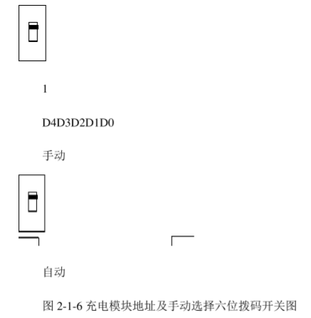 模塊面板上嵌入的電位器用來調(diào)整模塊在手動(dòng)狀態(tài)下的輸出電壓,注意只有在手動(dòng)方式下,調(diào)節(jié)該電位器才起作用。充電模塊地址及手動(dòng)/自動(dòng)撥碼開關(guān)用來設(shè)置模塊通訊地址和選擇手動(dòng)功能,其定義如圖2-1-6所示: