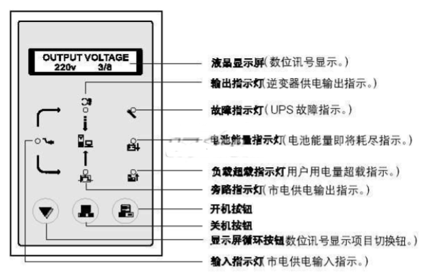(2按一下關(guān)機(jī)按鍵后,可將ups逆變器關(guān)機(jī),改由市電旁路供電。此鍵主要作為ups日常開關(guān)機(jī)使用。