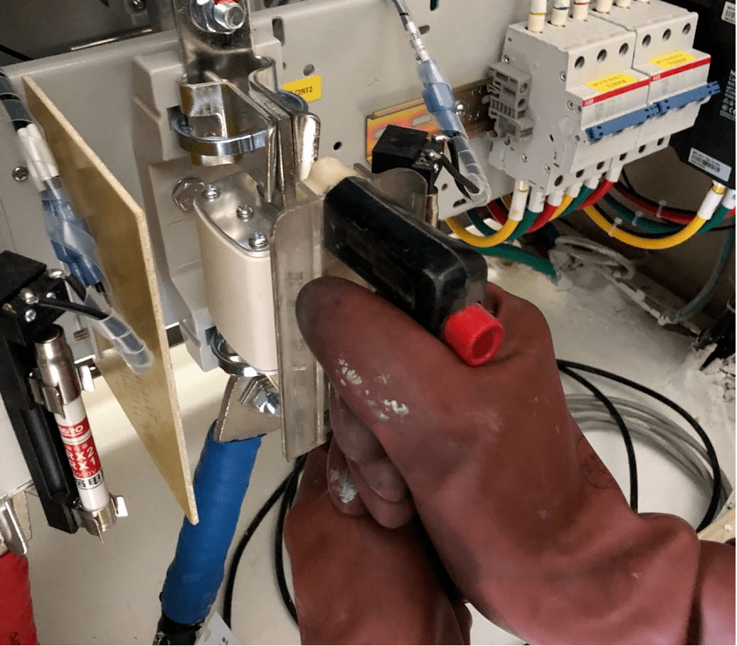 2. 取蓄電池組保險時,應戴絕緣手套,并站在絕緣墊上。