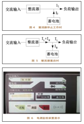 (4)當(dāng)從停電狀況到電源恢復(fù)供電時(shí),整流器再次發(fā)動(dòng),此時(shí)整流器既要向負(fù)荷輸出供電,同時(shí)還要向蓄電池充電,彌補(bǔ)蓄電池耗費(fèi)的電能,直至蓄電池充電結(jié)束。如圖5所示。