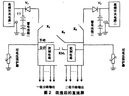 改進(jìn)后的直流屏添加刀閘K1、K2、K3,兩個(gè)阻隔二極管V1、V2,直流接觸器KM,及操控回路。這樣能更好地操控電源的輸人切換,便于保護(hù)。