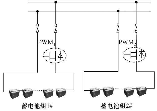 在并聯(lián)保護器中的直流屏與蓄電池組之間接入IGBT(insulated gate bipolar transistor),通過PWM電路控制充電電壓和充電電流大小,對充電電流進行限制。兩組蓄電池通過并聯(lián)保護器并聯(lián)連接時,其充電通道并聯(lián)等效電路如圖3所示。