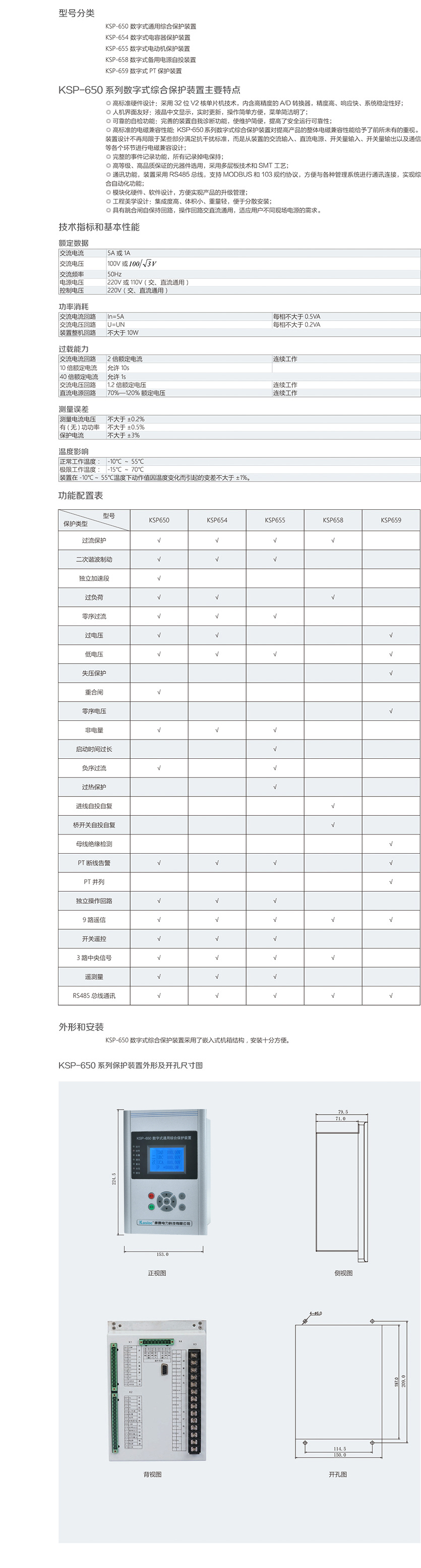 KSP-650 系列數字式保護裝置,是我公司最新推出的一款實用型綜 合保護裝置。裝置功能齊全,運行穩(wěn)定,采用通用型一體化設計理 念,具備保護、測量、控制、通訊完備的功能,廣泛適用于 35kV 及 以下電壓等級變配電站、開閉所等場合。新穎的結構設計,外觀時尚, 結構精巧,既適用于安裝在中置柜內,也可方便安裝于柜體體積狹 小的環(huán)網柜等各種柜體。